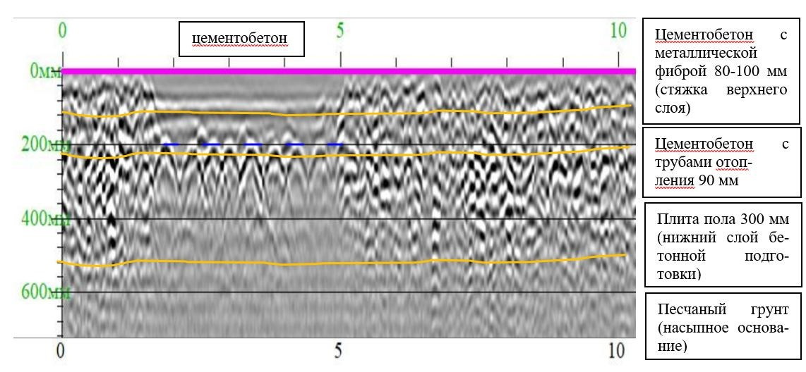 Survey results are presented as radargrams—cross-sectional plots along measurement profiles—highlighting anomalous zones and structural features of the investigated medium.